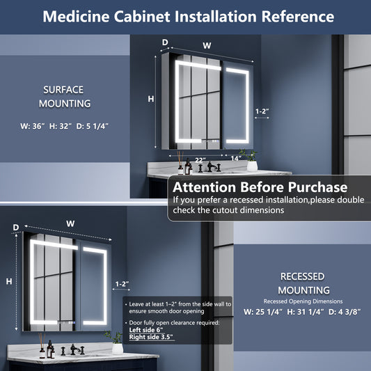 Boost-M2 36" W x 32" H Bathroom Light Medicine Cabinets Recessed or Surface Defogger, Dimmer, Clock,Outlets & USB