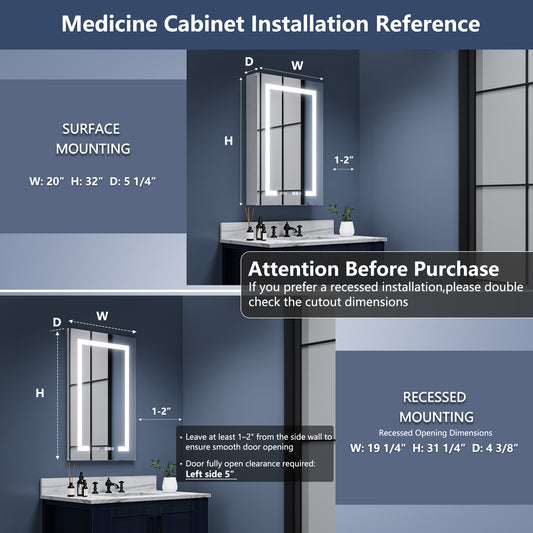 Rim 24" W x 32" H LED Lighted Medicine Cabinet Recessed or Surface with mirrors,Hinge on the left