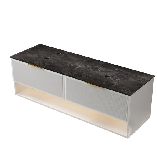 Exbrite 60' Wall Mounted White Plywood Cabinet with Two Drawers and One Open Shelf, Black Stone Sintered Stone Top, NO Basin, NO Faucet and Sink Cover|MALONE
