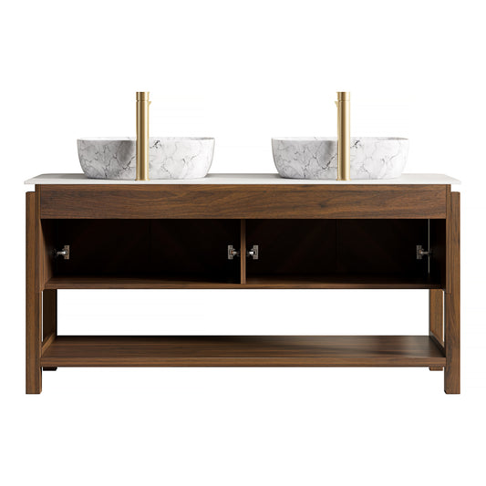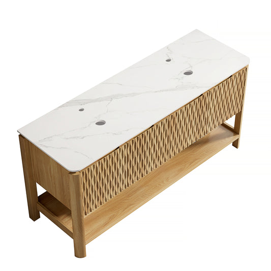 Exbrite 60'' Freestanding Cabinet with 4 Doors&Open Shelf, Carrara White Sintered Stone Top, NO Basin, NO Faucet and Drain, Woodgrain Color|SHARMA