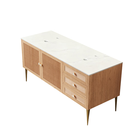 Exbrite 60' Freestanding Bathroom Light Oak Woodgrain Plywood Cabinet with Carrara White Sintered Stone Counter Top, Three Drawers and Two Doors, NO Basin, NO Faucet and Sink Cover|MUNIN