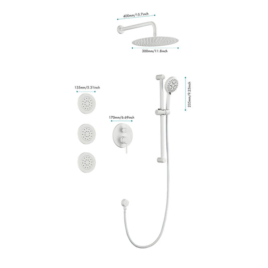 4PC3 Exbrite Shower System with Shower Head, Hand Shower, Slide Bar, Bodysprays, Shower Arm, Hose, Valve Trim, and Lever Handles,white