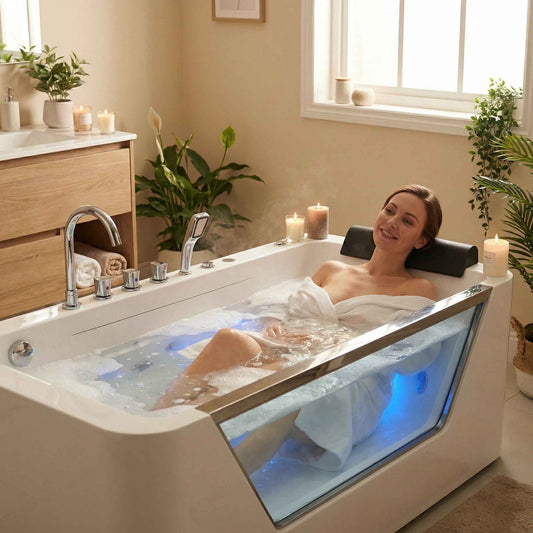 67" Whirlpool Bathtub, Hydrotherapy Jetted Bathtub with Glass Panel, 7 Jets,3-Side Apron,89 Gallons,White|Exbrite