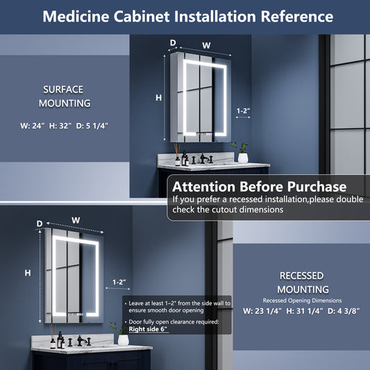 Illusion-B 24" x 32" LED Lighted Inset Mirrored Medicine Cabinet with Magnifiers Front and Back Light,Hinge on Right