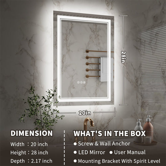 Linea 20" W x 28" H LED Heated Bathroom Mirror,Anti Fog,Dimmable,Front-Lighted and Backlit, Tempered Glass