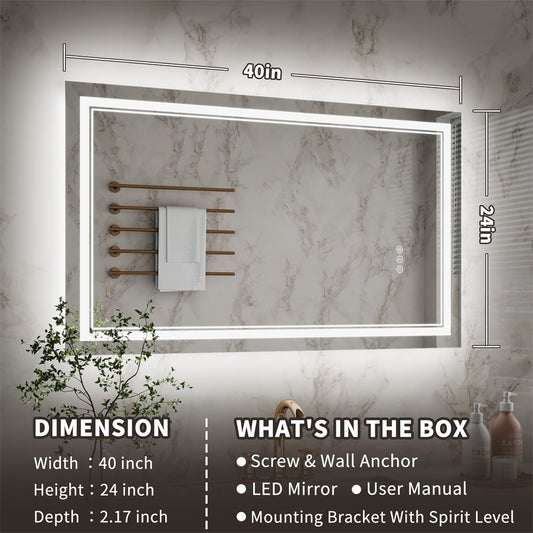 Linea 40" W x 24" H LED Heated Bathroom Mirror,Anti Fog,Dimmable,Front-Lighted and Backlit, Tempered Glass