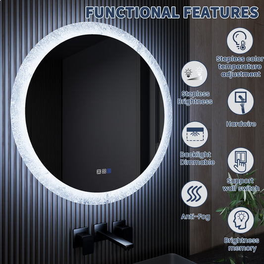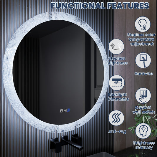 Glacy Series 30" x 30" Round LED Bathroom Mirror – Ice Textures Edge, Smart Dimming, Defogger, ETL Certified