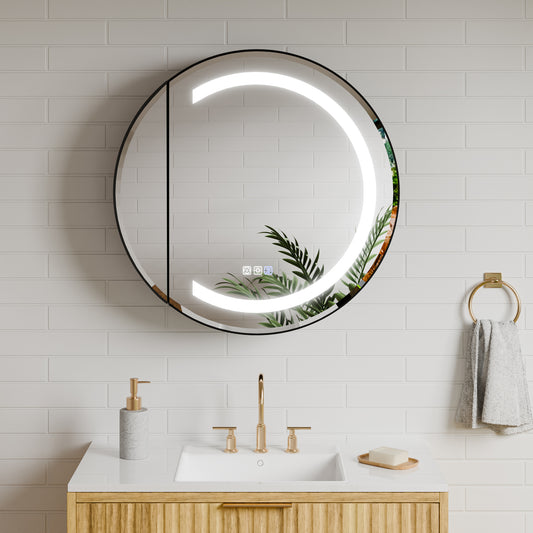 Hola 30" Round LED Medicine Cabinet – Black Frame, Anti-Fog, Dimmable Lighting, Surface Mount