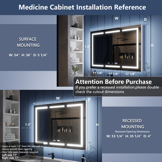 Illusion-B 54" x 36" LED Lighted Inset Mirrored Medicine Cabinet with Magnifiers Front and Back Light