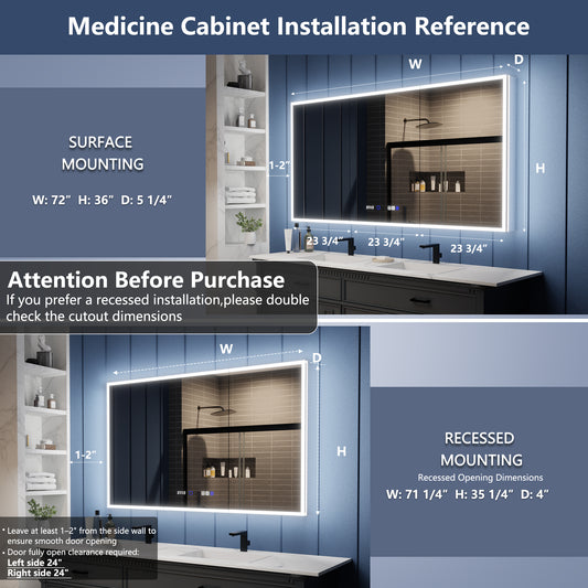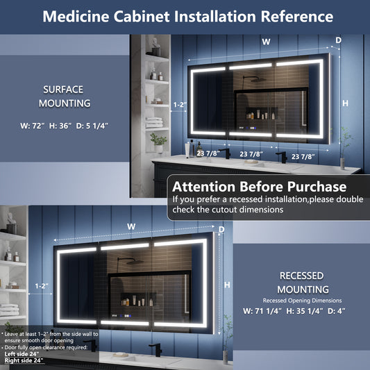 Illusion-B 72" x 36" LED Lighted Inset Mirrored Medicine Cabinet with Magnifiers Front and Back Light