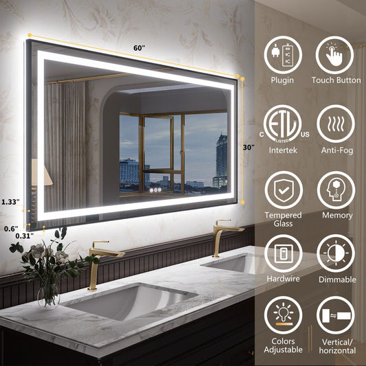 Apex-B 60x30in Vanity Mirror with Lights for Bathroom Wall,Framed LED Bathroom Mirror,Anti-Fog,Shatter-Proof,ETL Listed
