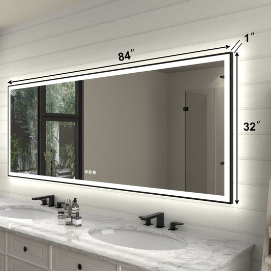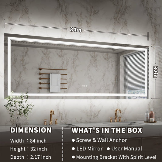 Linea 84" W x 32" H LED Heated Bathroom Mirror,Anti Fog,Dimmable,Front-Lighted and Backlit, Tempered Glass