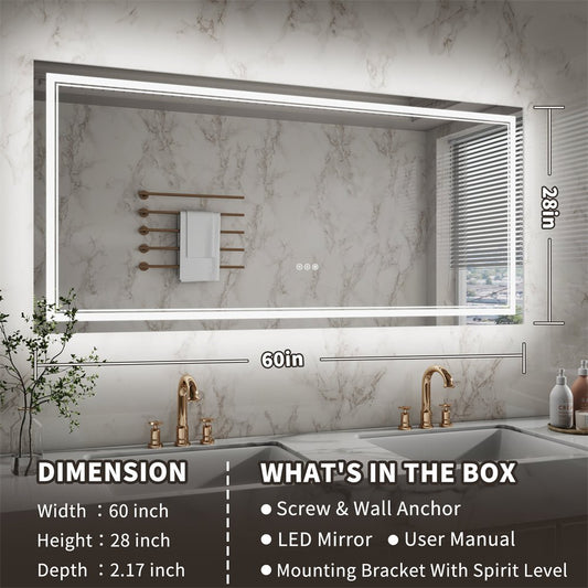 Linea 60" W x 28" H LED Heated Bathroom Mirror,Anti Fog,Dimmable,Front-Lighted and Backlit, Tempered Glass
