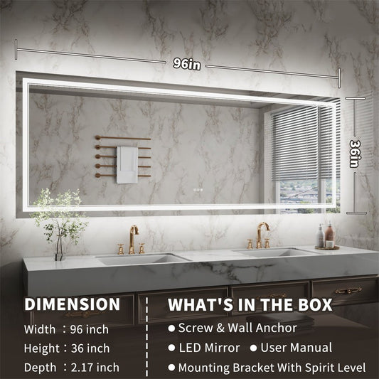 Linea 96" W x 36" H LED Heated Bathroom Mirror,Anti Fog,Dimmable,Front-Lighted and Backlit, Tempered Glass