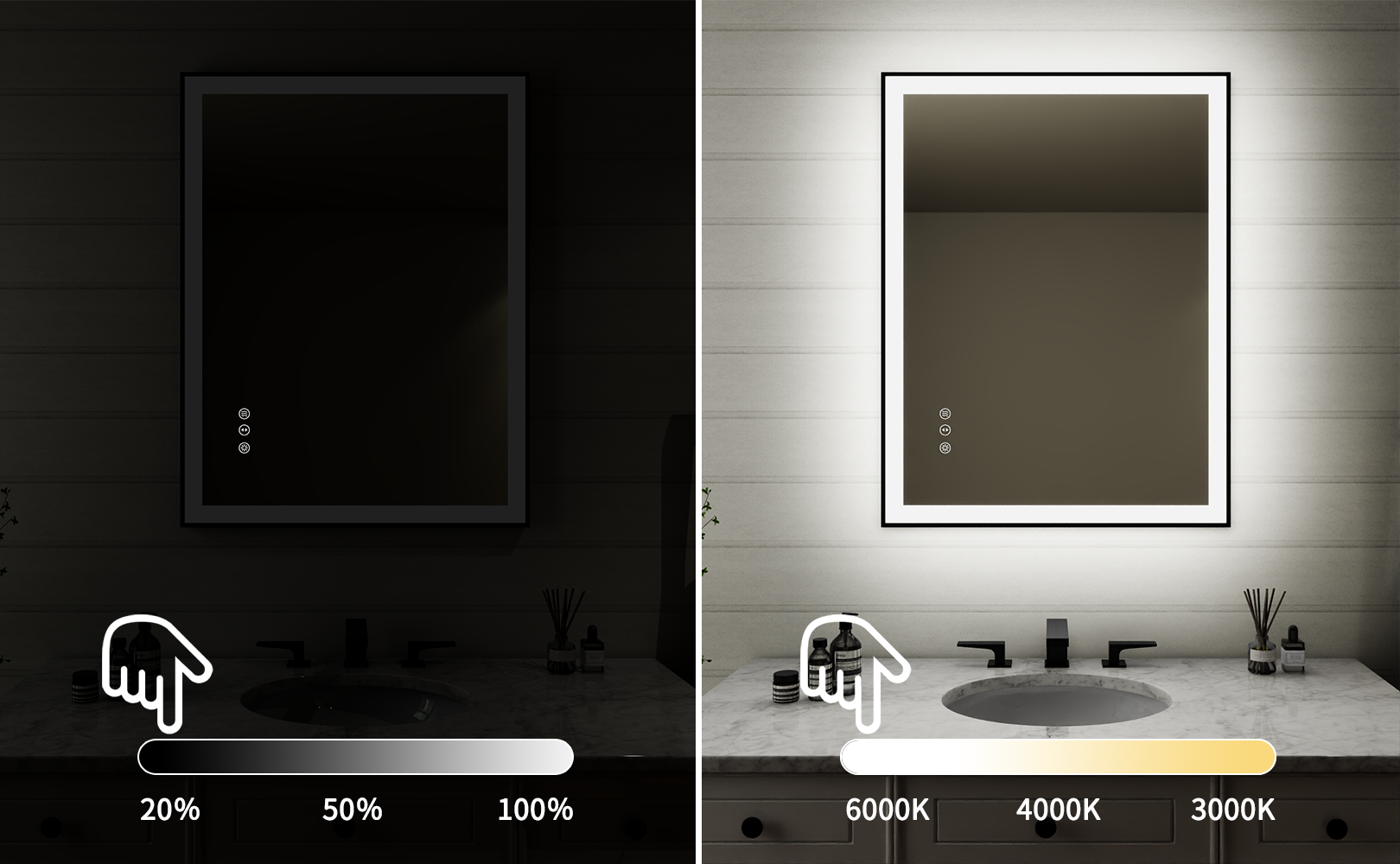 - 【Upgrade Brightness Stepless Adjustment】Apex Framed lighted mirror support three color temperature and brightness dimmable. Short press to change the colors(warm white 3000K/neutral lights 4000K/white lights6000K). Long press to adjust the brightness from 20% to 100% or change the color steplessly.