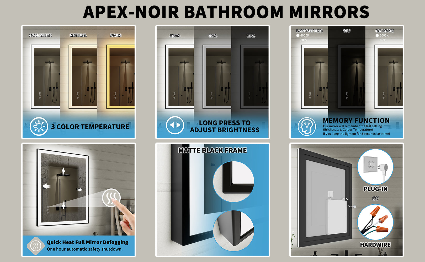 Inspired by modernism and functionality, the Apex Noir Series combines a sleek black frame with high-quality features. The mirror’s sophisticated design enhances both durability and style, while its versatile functionality—adjustable lighting, color temperature, anti-fog, and easy installation—makes it the ideal choice for any space. Perfect for those who want a stylish yet practical focal point in their bathroom or dressing room.