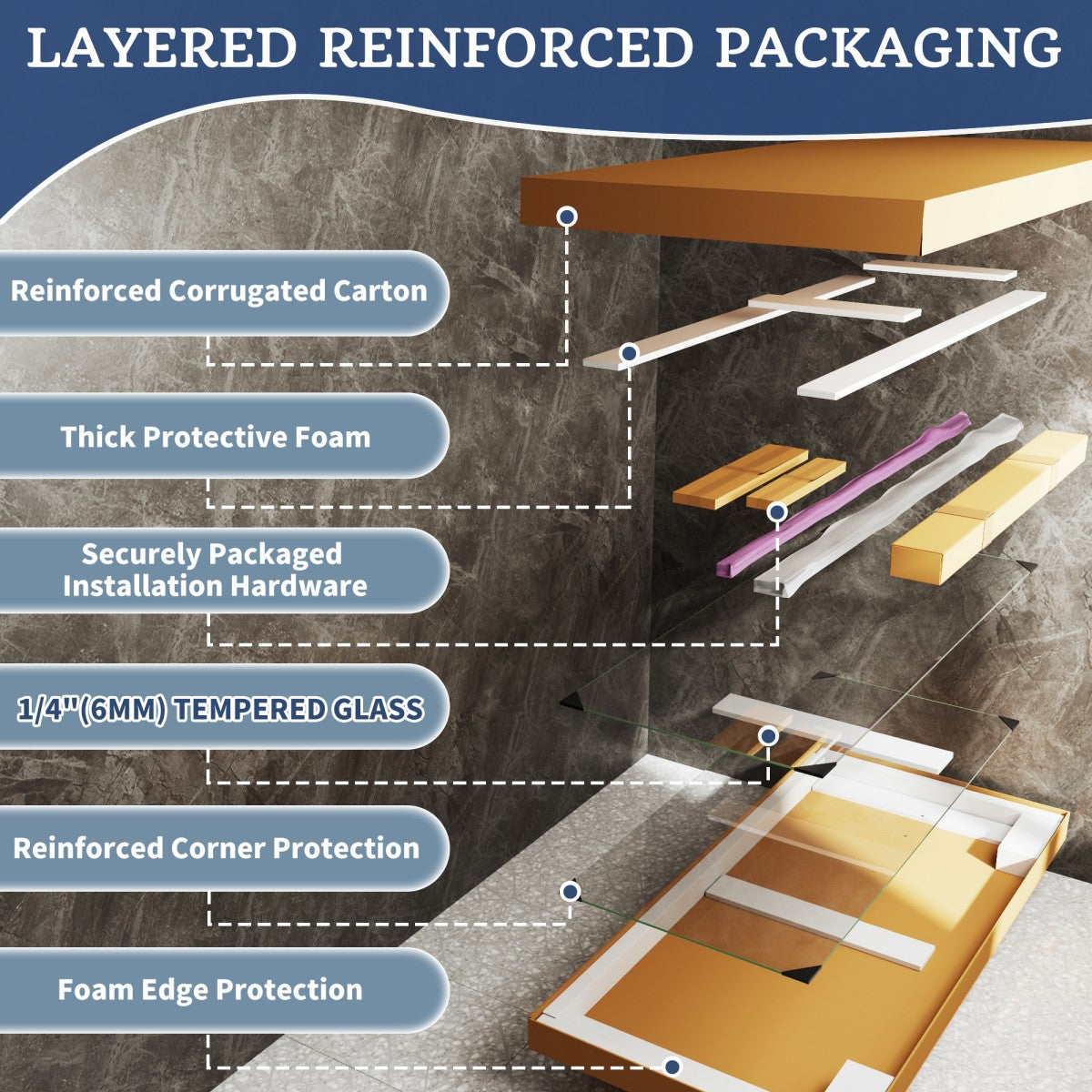 - Certification : SGCC Certification(Ensures the glass is safe and won't break into dangerous shards.);ANSI Z97.1 Certification(Ensures the glass is tempered and breaks into safe, small pieces.)