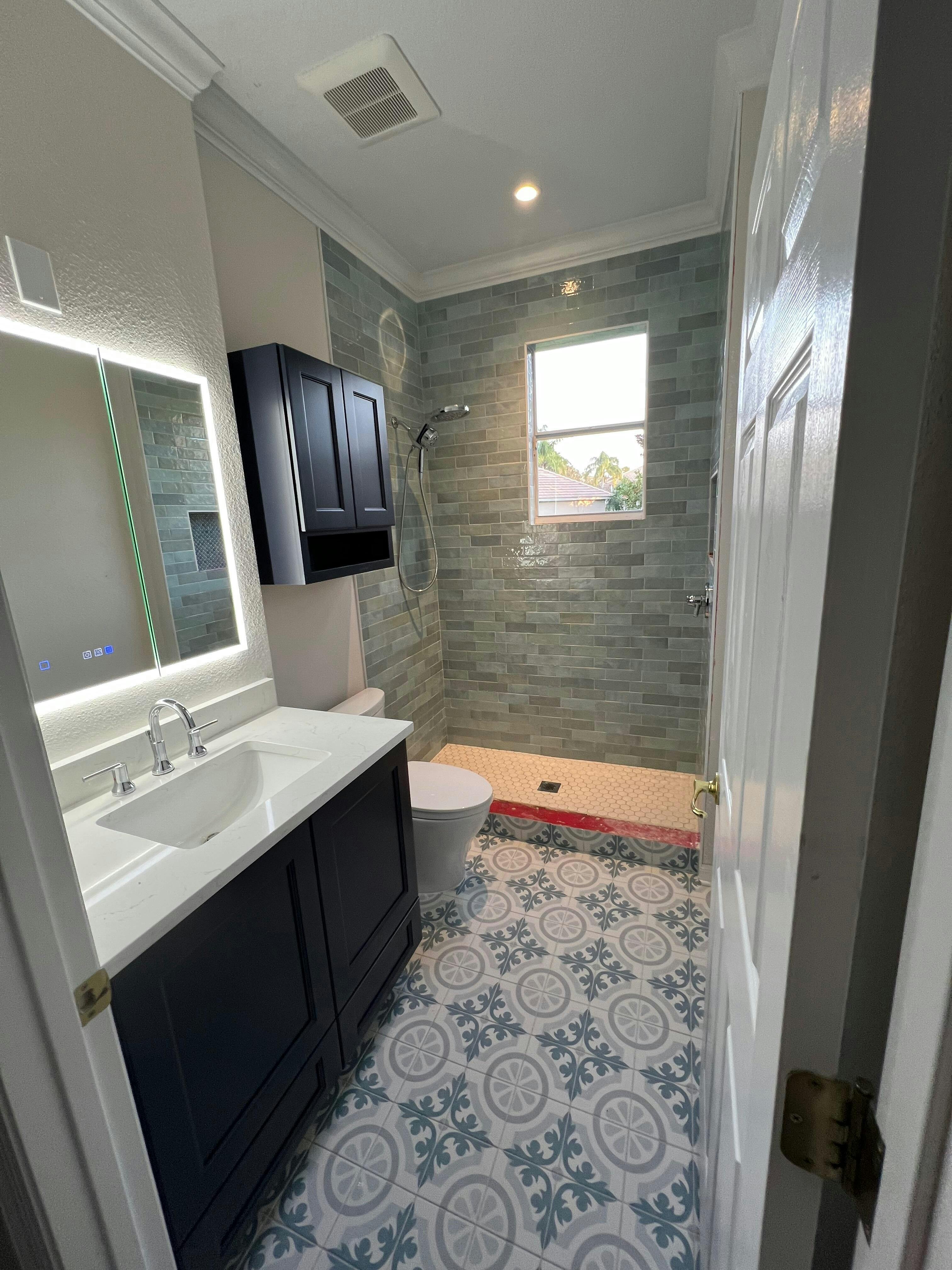 · A centered cabinet over the sink looks clean and balanced.