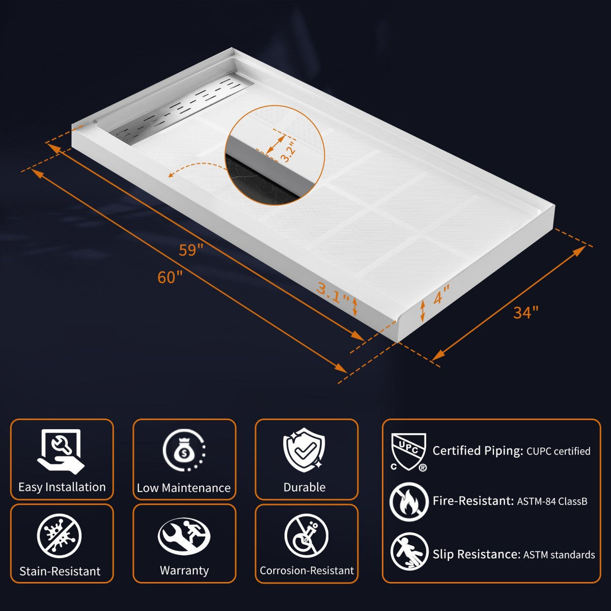 Pequod-L 60"x34" Premium Solid Surface Composite Shower Base,Non-Porous,Stain-Resistant,Long-Lasting