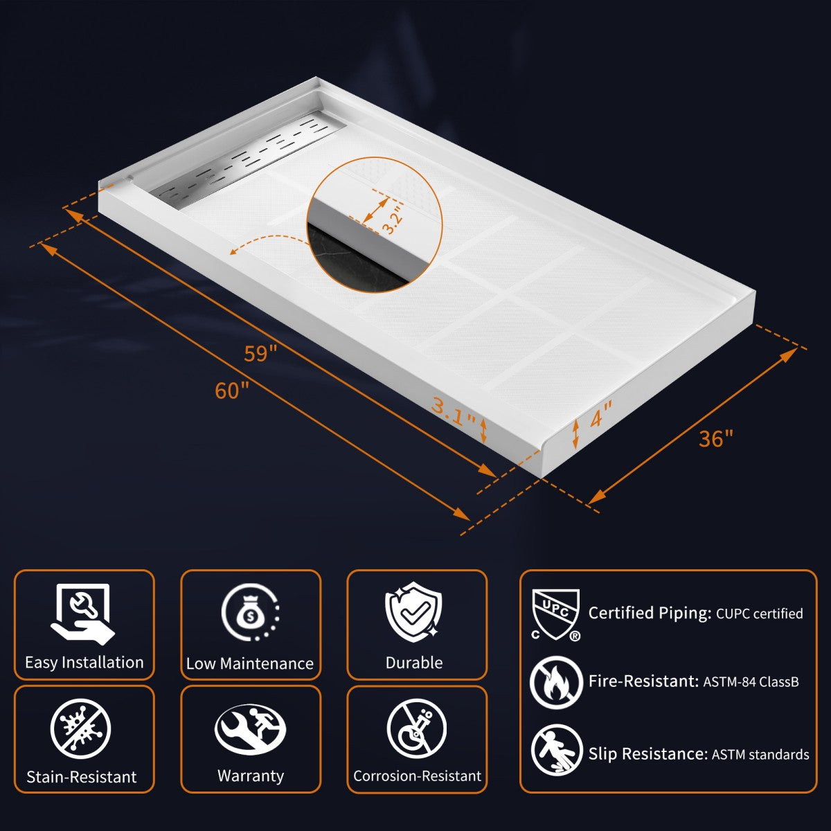 ASTM Standard Compliance: Slip-resistant and CUPC Certified, adhering to U.S. plumbing codes.