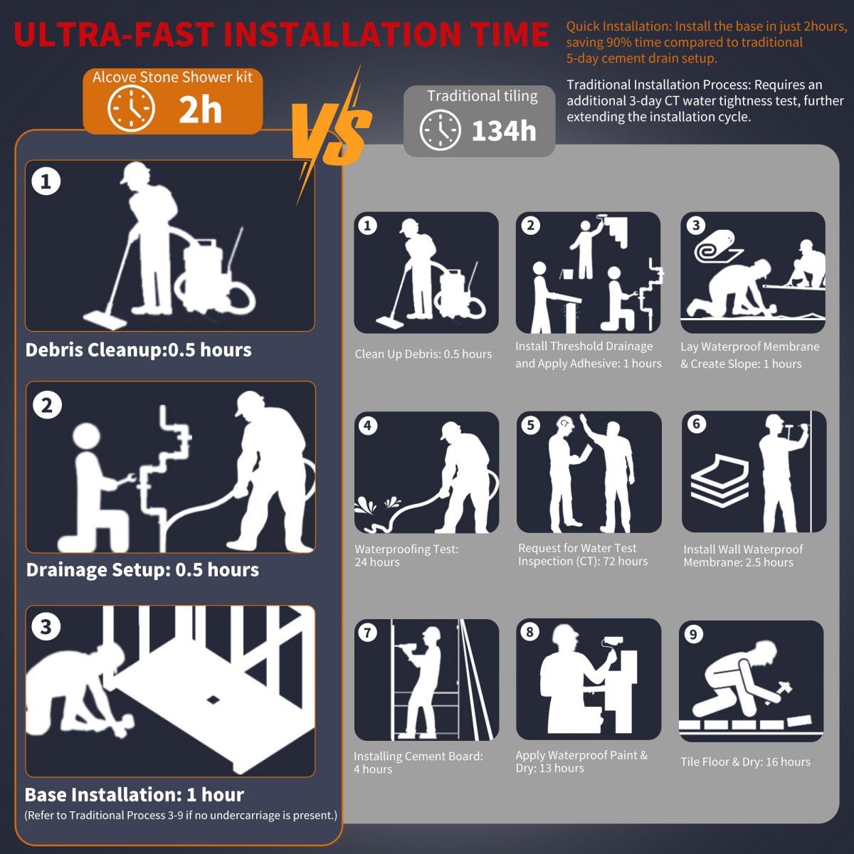 Quick Installation: Install in just 2 hours—90% faster than traditional cement-based drains (130 hours).