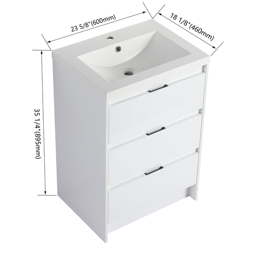 Allsumhome 24' Freestanding Bathroom Cabinet with Resin Sink, 3-Soft Close Drawers, Glossy White,(KD-Packing)