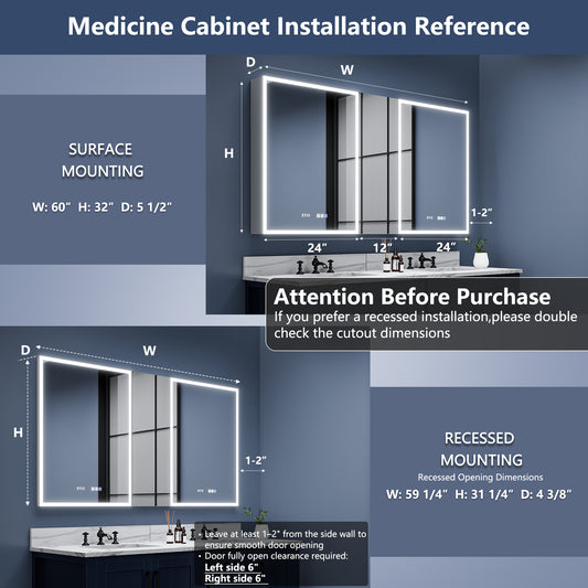 Rim 60" W x 32" H Lighted Medicine Cabinet Recessed or Surface LED Medicine Cabinet with Outlets,USBS