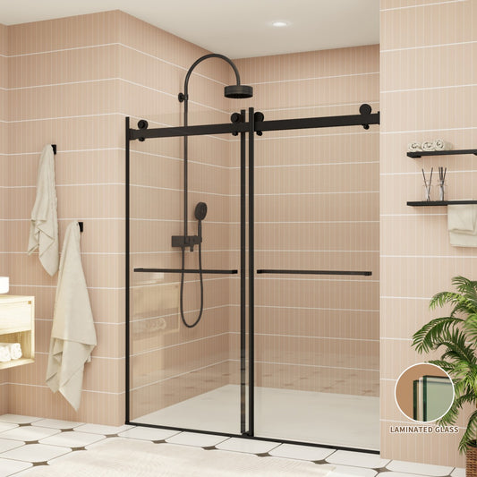 ExRoll-PL Allsumhome 56"-60"W x 70"H Frameless Double Sliding Shower Door,8mm Laminated Glass,Shatterproof,Noise-proof,UV-proof,Tempered Glass Shower Enclosure,Matte Black,Buffer