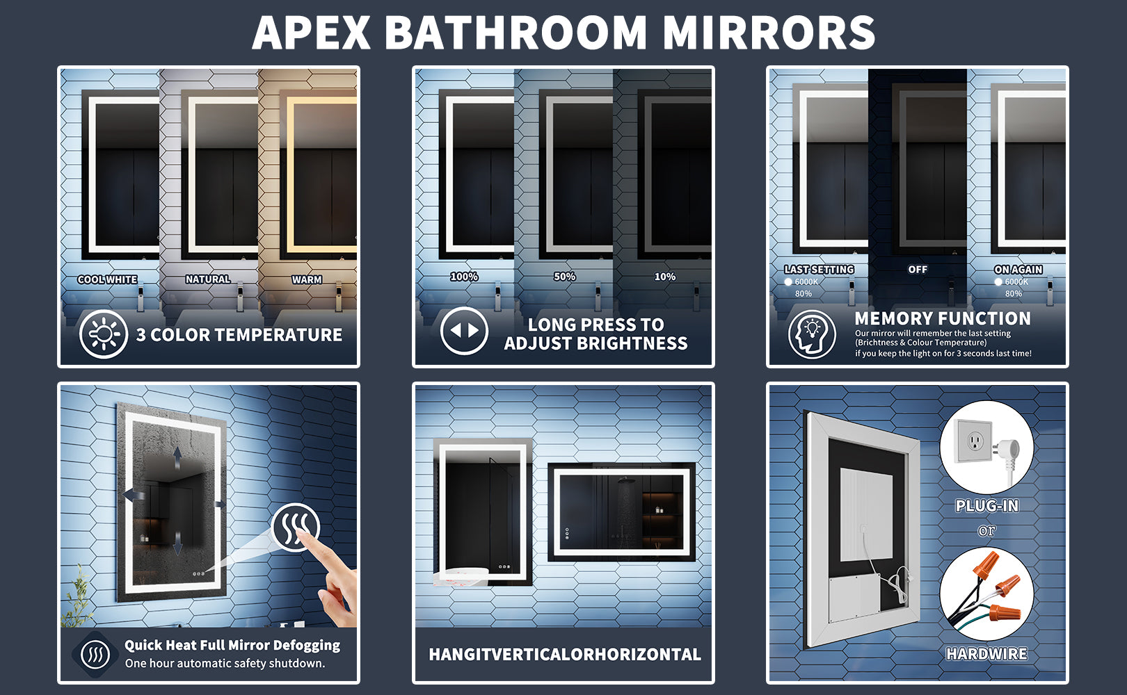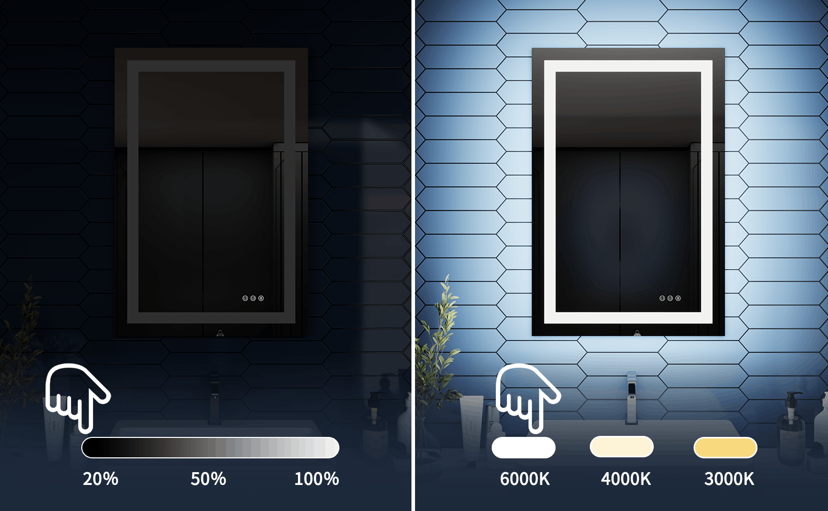 Dimmable LED Lighting: The LED bathroom mirror is equipped with a touch-sensitive button for dimming. By holding the power button for 2-3 seconds, you can adjust the brightness from 10% to 100%. The mirror remembers your last brightness setting, eliminating the need for constant adjustments.