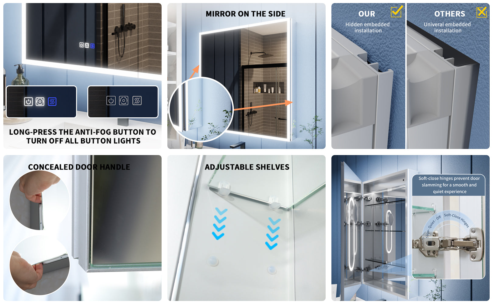 1. Elevate your daily bathroom experience with our stepless dimming LED medicine cabinet, which offers fully adjustable brightness and color temperature settings.
