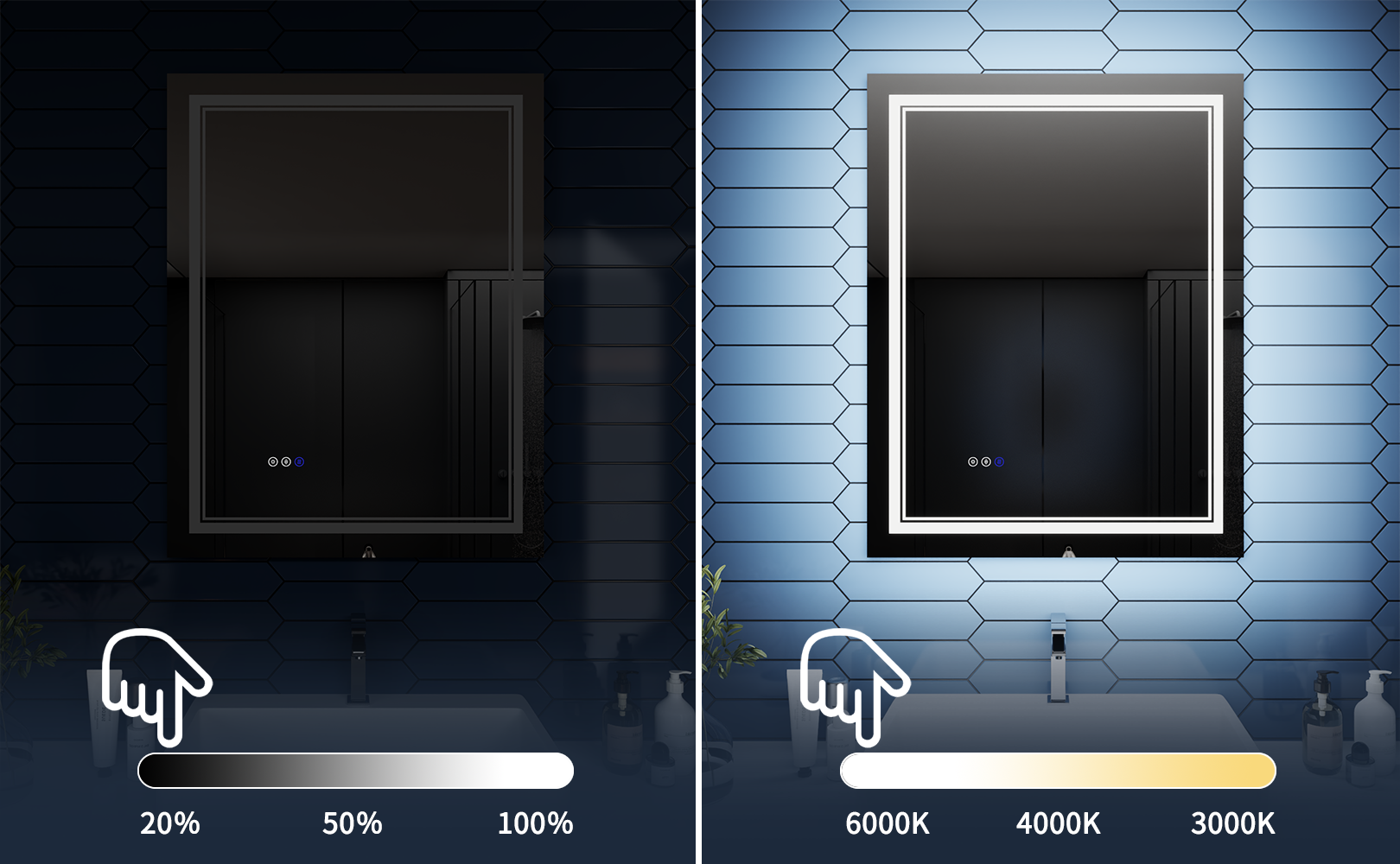 Dimmable Lighting: The LED bathroom mirror features a touch-sensitive button for brightness control. By pressing the power button for 2-3 seconds, you can easily adjust the brightness from 10% to 100%. The mirror remembers your last setting, eliminating the need for repeated adjustments.