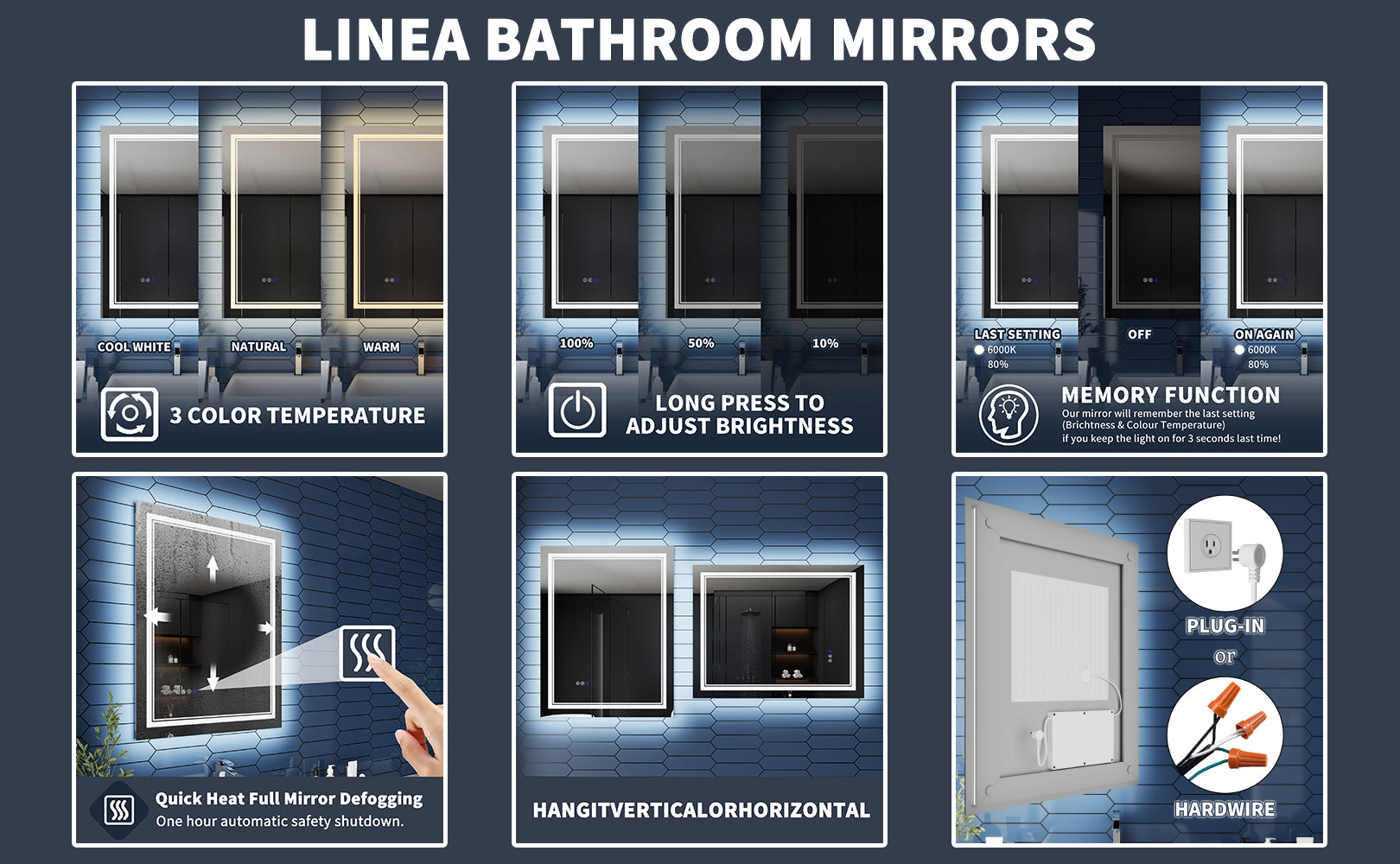 Enhance your bathroom experience with the Linea Series LED Bathroom Mirror, featuring a convenient one-touch anti-fog function. Simply press a button, and the mirror instantly clears up any mist, ensuring a crystal-clear reflection every time. Perfect for a steamy shower or morning routine, this mirror combines practicality and modern design.