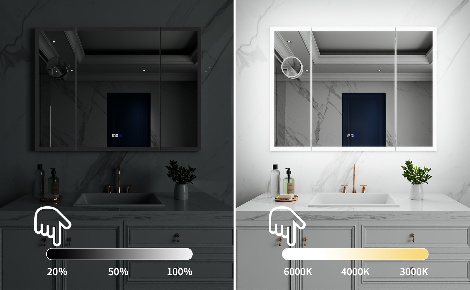 Stepless Dimming and Color Temperature Adjustment: Effortlessly modify the brightness from 10% to 100% and adjust the color temperature between 3000k and 6000k. This mirror also includes a power-off memory function that recalls your previous settings, ensuring convenience without the need for readjustments.
