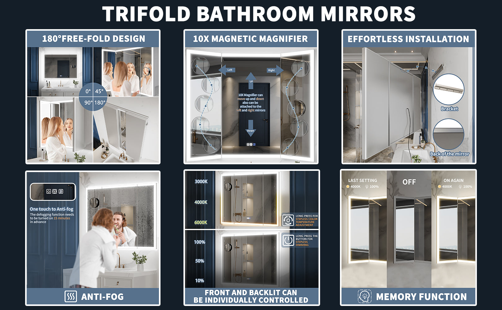 - The Trifold Series features an innovative 180 triple-fold design that allows each side panel to rotate completely, providing a wide and adjustable view. The versatility enables you to see yourself from every angle, ensuring precise grooming or makeup application.