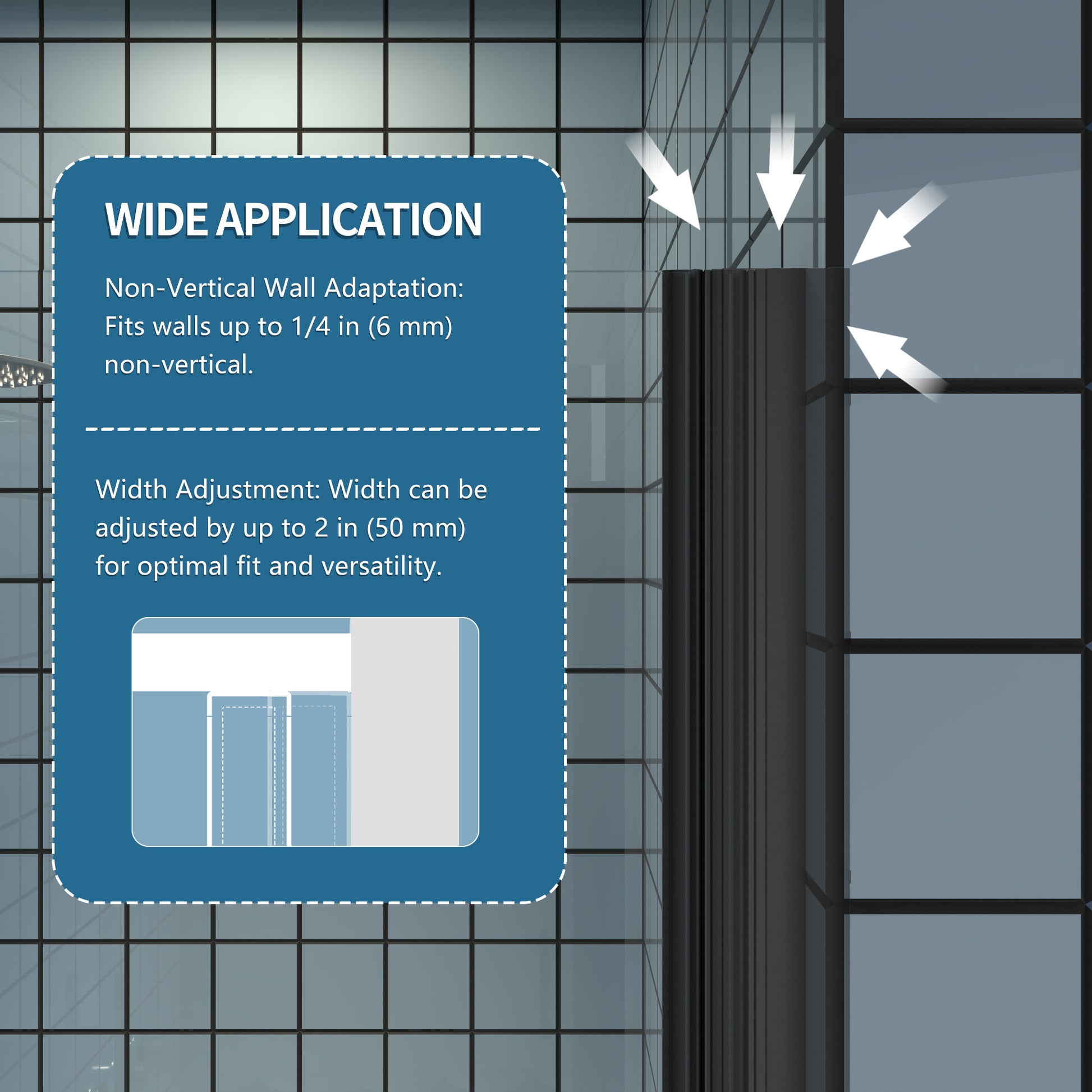 Flexible Installation: 2in adjustable range allows for easy customization without affecting the entry width. Suitable for irregular walls with 1/4in non-vertical adjustment, making it ideal for unique bathroom layouts.