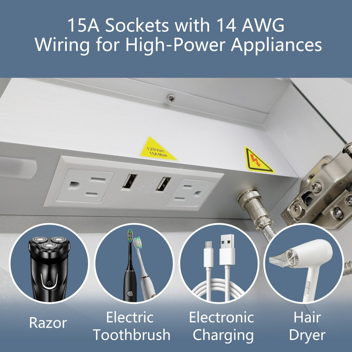2. Our cabinet features a built-in power outlet designed to safely support high-power appliances, making it perfect for hair dryers, electric razors, and more.