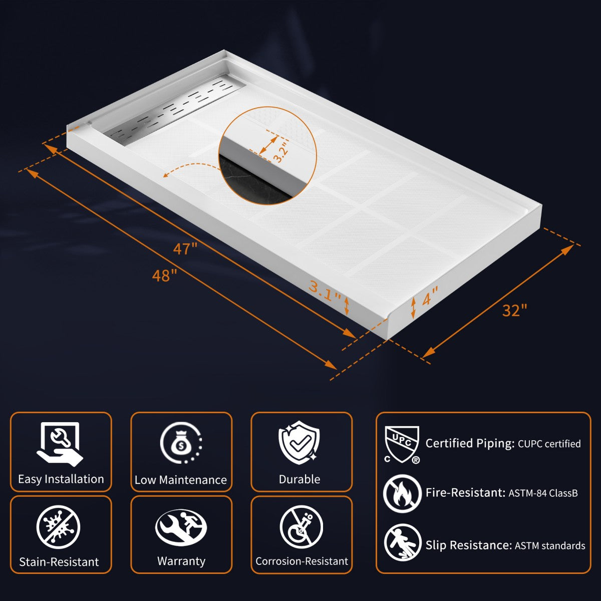 ASTM Standard Compliance: Slip-resistant and CUPC Certified, adhering to U.S. plumbing codes.