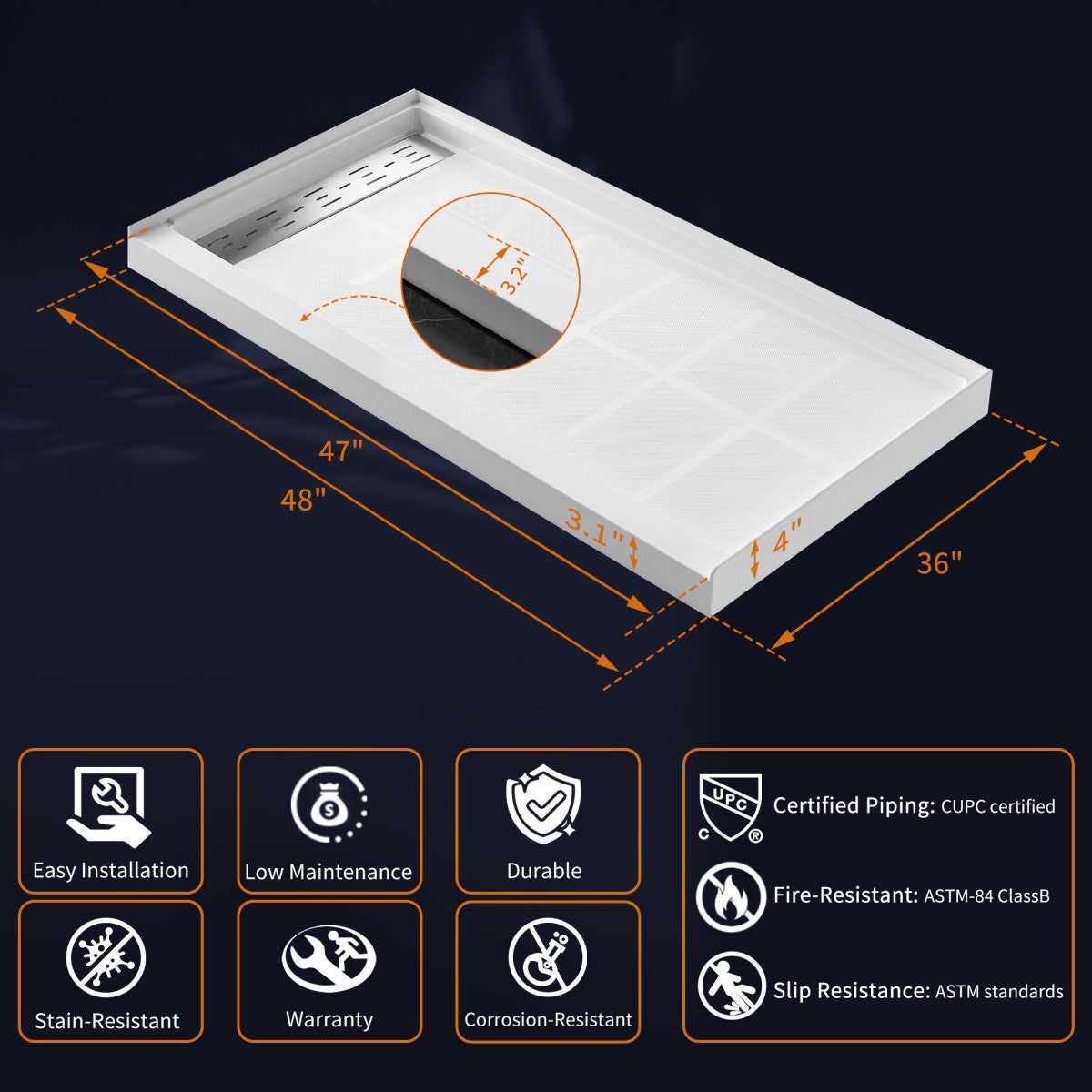 Pequod-L 48"x36" Premium Solid Surface Composite Shower Base,Non-Porous,Stain-Resistant,Long-Lasting